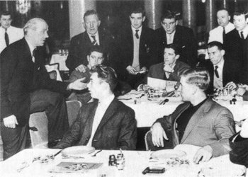 In a moving scene the meal ended when waiters entered the dining room carrying trays of sweetmeats lit by candles set in ice. The United party stood to applaud the skill of the Yugoslav chef, and Roger Byrne led his colleagues in song: